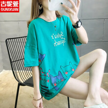 古妮萱短袖t恤女2020夏季新款大码女装卡通刺绣学生宽松韩版百搭半袖网红潮款上衣服 绿色 请拍正确尺码或咨询在线客服