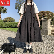 阿么茜夏天青少女学生学院风日系软妹可盐可甜套装女木耳边背带连衣裙+短袖衬衫两件 黑色背带裙 均码