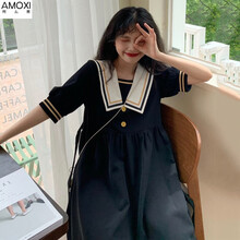 阿么茜夏天初中学生海军领连衣裙少女夏装2021新款韩版宽松日系学院风长裙子 黑色 M