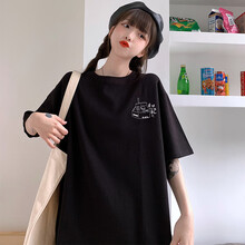 蚊子姐日系复古短袖T恤女宽松夏季2021新款百搭韩版学生bf原宿风半袖女遮肚子显瘦上衣服 黑色 L