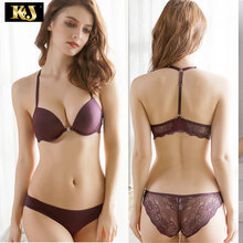 KJ前扣美背文胸女士无痕薄款内衣 性感光面上薄下厚小胸聚拢胸罩女 紫色 75D=34D(套装)
