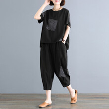 雁皇【捡漏特价】女夏印花大妈棉麻两件套大码宽松遮肉上衣休闲哈伦裤洋气亚麻套装新品 图片色 XL【150-175斤】