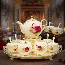 美瓷工坊 欧式咖啡具套装 宫廷陶瓷茶具英式下午茶杯碟勺配托盘 家用红茶花茶金边水具 英伦玫瑰2026 大壶+糖罐+奶壶+6杯6勺+加热底座+陶瓷四脚托盘