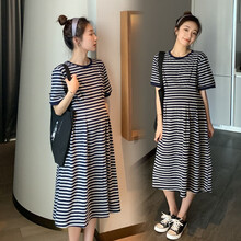 摩百尼大肚婆孕妇连衣裙长款夏装条纹孕妇装夏天短袖孕妇裙子夏季2021新款辣妈宝妈显瘦遮肚不显怀 灰蓝色条纹裙 XXL