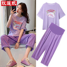 玫莲凯 孕妇装夏季孕妇套装休闲运动风时尚减龄孕妇上衣+托腹裤外出九分裤潮妈两件套 紫色套装 M