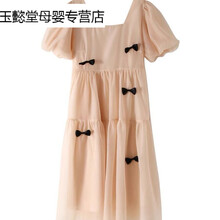青年里孕妇蝴蝶结连衣裙时尚款纱裙潮妈外穿夏季中长款方领长裙夏装裙子 杏色 M