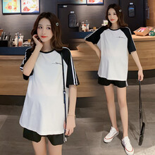 伊沐纯孕妇装夏时尚休闲短袖T恤上衣托腹短裤怀孕期外穿潮妈两件套 黑拼白短袖+黑色短裤6668# M