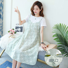 依鎏衣品孕妇装2021春夏新款孕妈哺乳碎花纯棉短袖宽松过膝孕妇长裙喂奶衣 浅绿色(哺乳款) M建议95-115斤