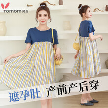兔妈 孕妇装假两件孕妇连衣裙夏季中长款时尚孕妇短袖裙薄款夏装裙子 黄白条 S