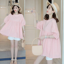 曼吉拉 孕妇装夏装2021孕妇套装潮妈纯棉显瘦孕妇上衣娃娃衫+托腹孕妇短裤 粉色上衣 L