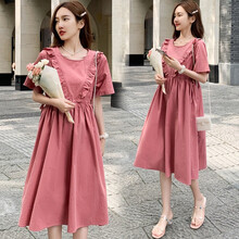 孕妇装夏装连衣裙夏季外出时尚款过膝减龄洋气孕妇裙夏天短袖大码宽松裙子潮妈 红色 M