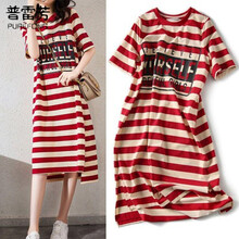 普雷芳孕妇装2021夏装新款时尚外出哺乳连衣裙中长款辣妈条纹T恤裙喂奶女装产后潮妈夏季 红色 M