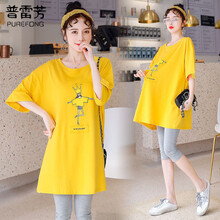 普雷芳孕妇装套装2021夏装新款时尚韩版宽松孕妇裙中长款短袖T恤上衣七分裤两件套潮妈 黄色上衣 L