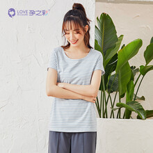 孕之彩孕妇上衣夏季圆领纯棉条纹短款T恤孕妈简约内搭时尚外穿可哺乳休闲T 浅兰 M