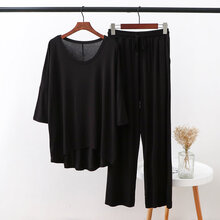 21新款莫代尔家居服女宽松大码月子服夏季薄款胖妈妈休闲套装睡衣两件套 黑色 (圆领上衣+裤子) L