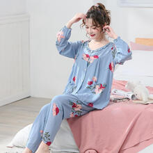 新品长袖棉绸睡衣女夏季薄大码人造棉开衫月子服家居服套装服 长袖开衫雾霾蓝花朵 3XL 【适合140-155斤】