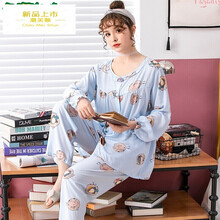 潮美顺棉绸睡衣女士长袖开衫加肥加大码夏天人造棉女产后月子服 湖蓝色 开衫蓝色娃娃 L适合90-115斤