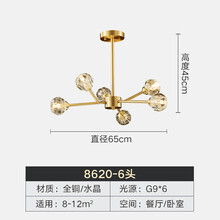 定制全铜北欧吊灯客厅餐厅灯具后现代简约轻奢灯饰魔豆创意水晶分子灯 全铜6头水晶吊灯白光