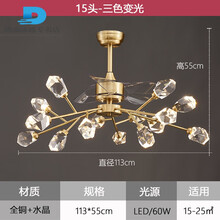 电灯风扇带灯吊扇灯扇一体带风扇的吊灯后现代轻奢全铜吊扇灯水晶客厅分子灯北欧餐厅卧室变频风扇吊灯 全铜 水晶款15头/三色变光