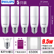 飞利浦led灯泡E27螺口圆柱形照明节能家用超亮筒灯台灯U型玉米灯五只装套装节能灯泡 【9.5瓦】E27/大螺口【6500K白光】五只装