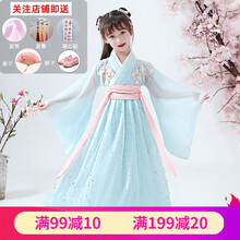 汉服女童儿童古装超仙襦裙连衣裙春秋12岁女孩樱花公主中国风长袖t 清新蓝 粉腰带(买一送五送鞋(下单留言鞋码)) 120(适合身高115-125cm)