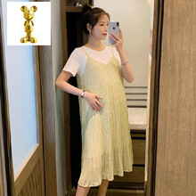 珂纷【甄选精品】孕妇连衣裙夏季雪纺2021新款时尚假两件吊带碎花裙子女夏装洋气 浅绿色假两件 M