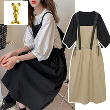 珂纷【甄选精品】孕妇装夏套装2021新款背带裙子夏季时尚欧美风高级夏天网红连衣裙 卡其色+黑色上衣 M
