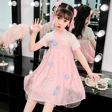 国货之光儿童汉服女童古装超仙夏装连衣裙12岁襦裙风洋气公主仙女唐装国潮 粉色樱花短袖 实物颜色稍深 120