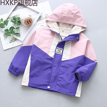 【特价捡漏】HXKP春秋新款儿童拼色冲锋衣中小童撞色拼接连帽拉链外套休闲运动服迪卡黑侬 粉紫色 110cm