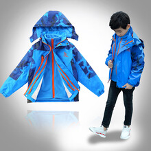 男童冲锋衣三合一儿童户外可拆卸秋冬加厚加绒童装中大童男孩外套 迷彩蓝色三合一 120