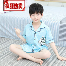 界方【新品】1-14岁6岁洋气小孩夏天穿的儿童睡衣男童短袖纯棉夏季薄款5岁-8岁-16岁男孩中大童 青色冰激凌夏 100码适合95cm-105cm