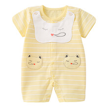婴儿连体衣0-1岁新生儿衣服宝宝短袖爬服纯棉夏季薄款哈衣爬爬服初生幼儿夏装冰丝镂空连身衣睡衣 黄色-小猫围嘴 80