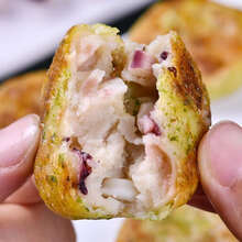 整个饼由鱼糜制成,每个饼都有鲜虾仁,外皮包裹玉米淀粉和海苔碎,无面粉和防腐剂。