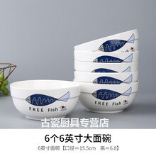 6英寸家用吃面碗 大碗泡面碗大号碗大汤碗陶瓷餐具组合饭碗瓷碗 比目鱼 6个6英寸面碗