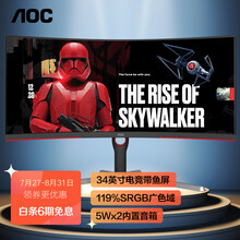 AOC 34英寸 带鱼屏 WQHD 1000R 广色域 165Hz HDR10 出厂校色 旋转升降 21:9 电竞曲面显示器 CU34G3S