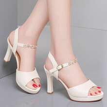 古奇天伦 凉鞋女一字扣带鱼嘴粗高跟鞋时尚单鞋时尚百搭休闲英伦风女鞋子 5439 米色 35