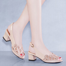 古奇天伦 凉鞋女一字扣带鱼嘴粗网面透气高跟鞋时尚单鞋百搭休闲英伦风女鞋子G8969-1 香槟色(跟高5.3) 38