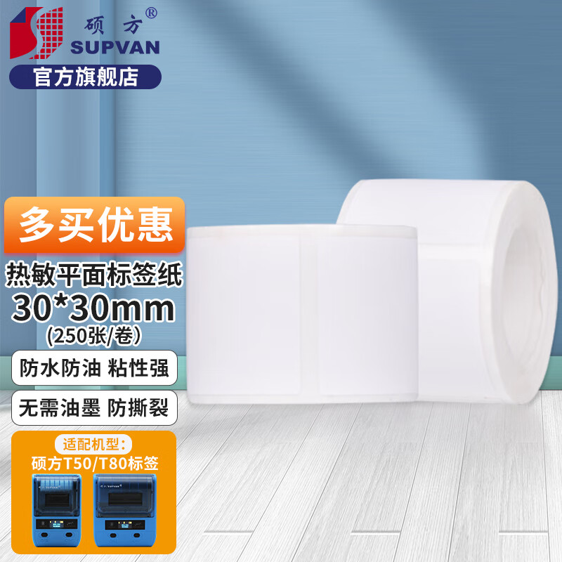 硕方T50标签机打印纸热敏不干胶标签纸服装吊牌食品商品价格标签贴纸固定资产仓储物流条码纸防水标签 白色平面标签30*30mm