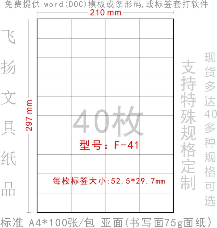 特点:粘胶胶质柔软,粘贴度特强激光打印机专用标签,具有防卡纸、防脱胶等。己直线模切割成一小块一小块的标签,用模板打印后撕下即可使用,只要适用:复印,激光打印、彩喷的标签机,针式打印机,使用简便,微软Word内置格式可直接套打,贴于信件、广告传单以及邮件包裹上,物流标签等等,处理方便。