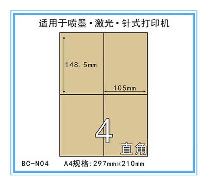 Specification: single size: A4-210 * 297mm; Single sheet label size: 105 * 148.5 mm;