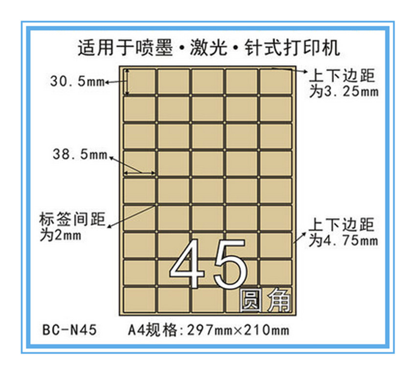Specification: single size: A4-210 * 297mm; Single sheet label size: 38.5 * 30.5 mm;