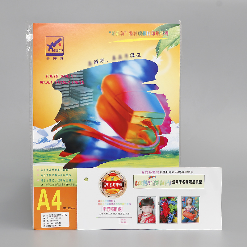 1、彩喷不干胶:也叫喷墨打印自粘标签材料,是以纸张、薄膜或特种材料为面料,面料涂有专用的吸墨接受涂层,吸墨接受涂层起到吸收打印机喷头喷印出的墨水,并起到固定墨迹作用,使其不扩散,使打印出来的图案色彩鲜新艳丽,(如是防水涂层,墨水防水性及涂层耐水性)。面料背面涂有胶粘剂,以涂硅保护纸为底纸的一种复合材料。