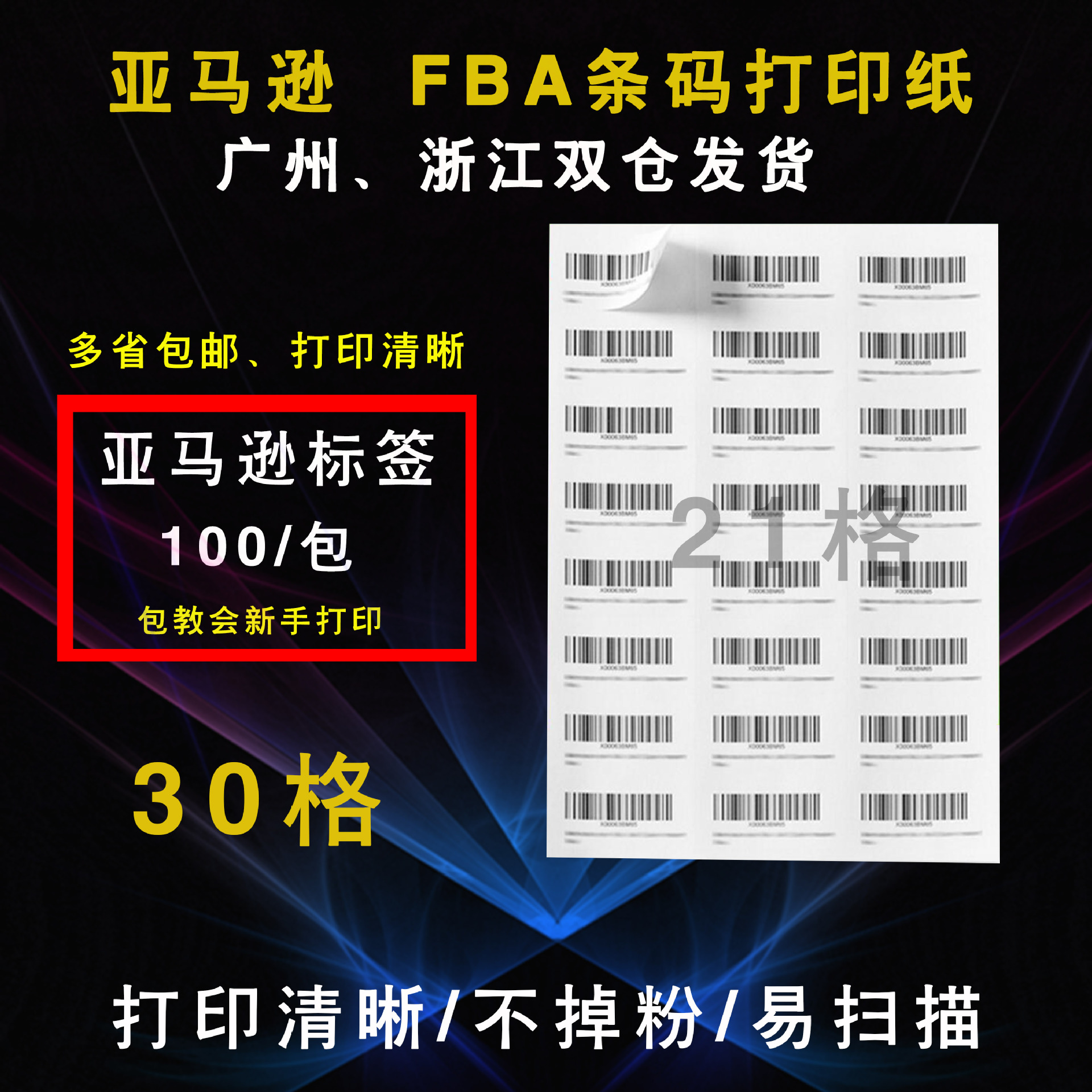 亚马逊FBA专用贴纸A4打印标签纸,单个不干胶标签尺寸:66.6*25.4mm,一张有30个不干胶标签,每包100大张。表面为亚面, 从亚马逊后台输出的PDF格式直接在普通打印机上使用。
