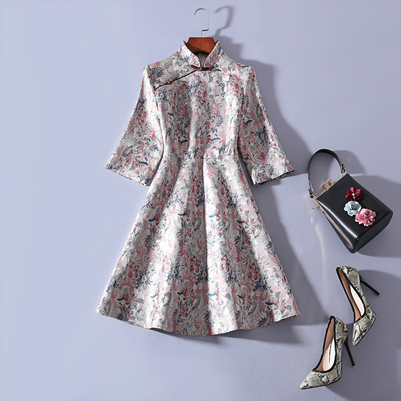 2018秋冬新款大摆型改良版连衣裙复古立领七分袖提花短款旗袍裙子