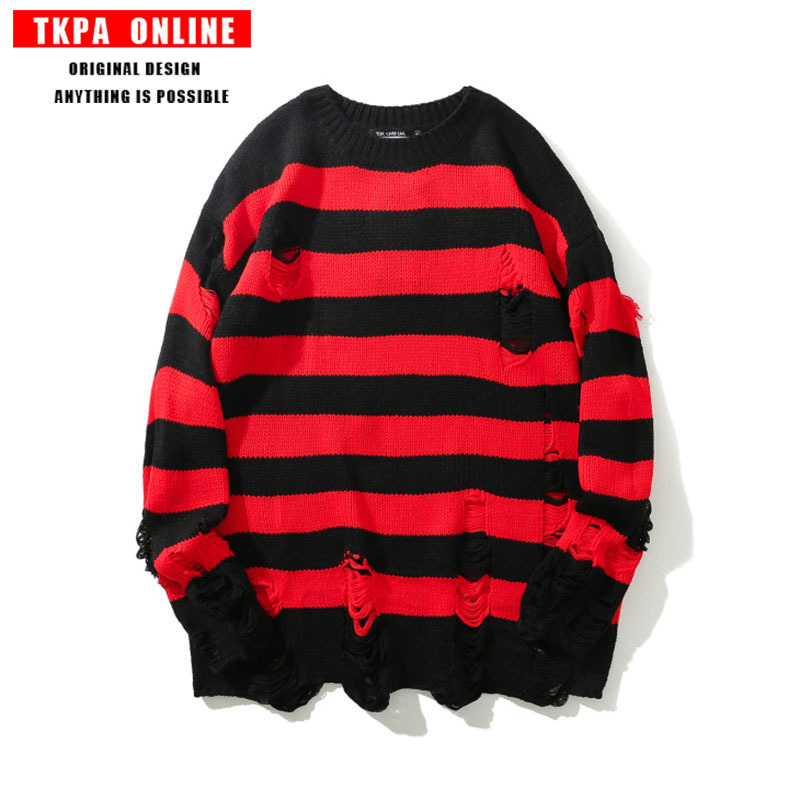 TKPA欧美高街复古朋克摇滚风红黑条纹宽松长款破洞流苏毛线针织衫