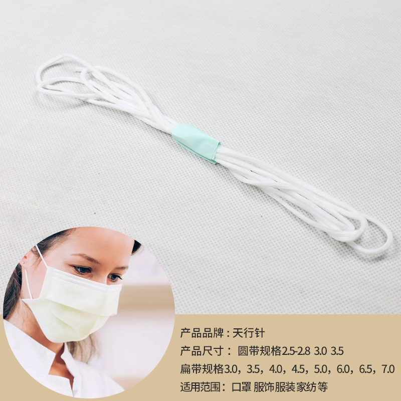 江阴天行针纺织有限公司是口罩耳带、一次性口罩耳带、耳带、松紧带、松紧绳等产品专业生产加工的公司,拥有完整、科学的质量管理体系。江阴天行针纺织有限公司的诚信、实力和产品质量获得业界的认可。欢迎各界朋友莅临参观、指导和业务洽谈。
