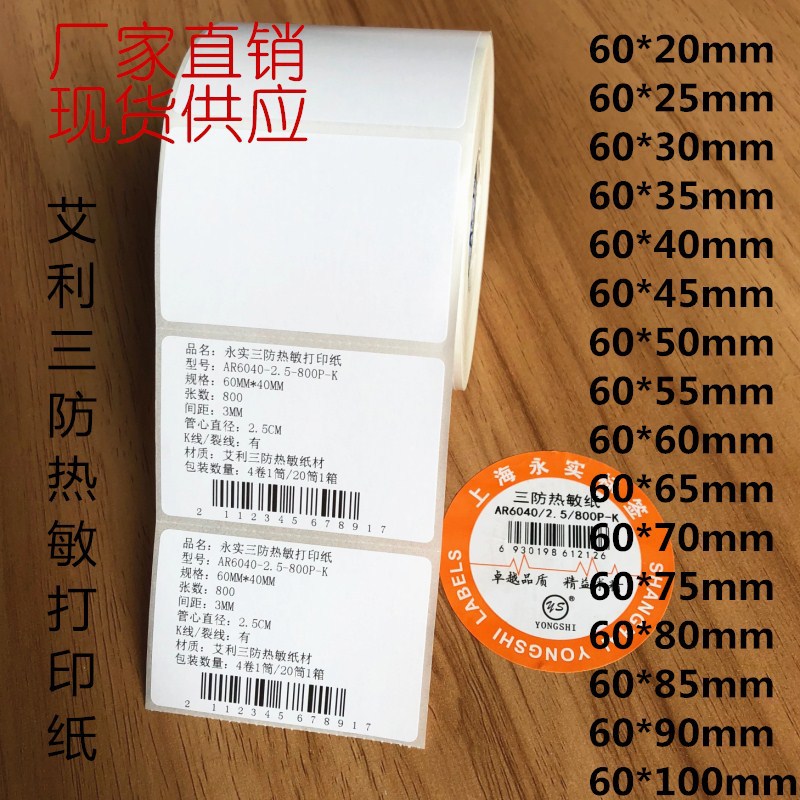 | 品名:永实三防热敏打印标签 材质:艾利三防热敏纸材 型号:AR60100/2.5/300P-K 规格:60mm*100mm(横版) 张数:300 管芯内径:25mm K线/裂线:有 包装数量:4卷1筒/20筒1箱 执行标准:HG/T2406-2014 产地:上海 | ![]() |
