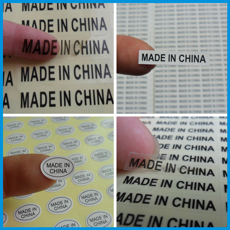 【品名】:中国制造产地标、 MADE IN CHINA 标签(椭圆形) 【材质】:铜版纸不干胶 透明不干胶 【尺寸】:椭圆形的这款是10*15毫米,长方形的有6*28毫米(3种),另外一种大长方形尺寸是13*70毫米,透明底黑色字大号15*60毫米 【排版】:长方形6*28毫米的是每张170个,长方形大尺寸的13*70毫米一张是45个, 椭圆形的是每张120个,大号透明黑色字15*60毫米一张26个 【颜色】:黑色文字 白色文字