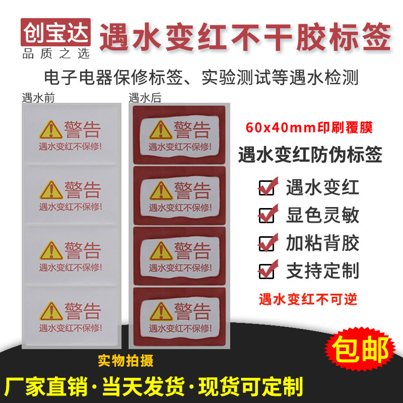 厂家定制遇水变红不干胶60*40mm20贴 水感标签 锂电池保修标