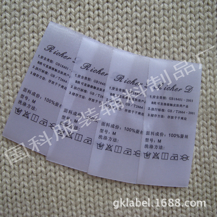公司引进了英国柔印设备,主要印制高档洗水布标,经公证行测试,不含偶氮,铅等其他化合物,绝对环保.可通过超强50次洗涤测试,不脱色.可印制极细字体,清晰,不断线.可以各种材质如涤纶,尼龙,纯棉带,织带,橡根带等上面印刷,效果完美, 布标印唛色牢度好与差,直接涉及人体的健康安全,色牢度差的产品在穿着过程中,碰到雨水、汗水就会造成印唛布标上的颜料脱落褪色,则其中油墨的分子和重金属离子等都有可能通过皮肤被人体吸收而危害人体皮肤的健康,再有如果你的服装是品牌产品或是你想打响你的品牌你一定要在你服装的印唛布标上面下工夫,因为如果你是一个消费者你会第一时间买衣服要看它的牌子和成份高档的印唛布标是你品牌的最好体现一个印唛布标在一件服装产品上的成本是很小的但它在这个产品上可起到了一个很大的作用,本厂(国科商标制造有限公司)专业从事中高档布标制作。可生产多达10个颜色的布标及四色网点标。本厂布标耐水洗不掉色我们的产品洗水不到4级我们是认为不合格的产品,耐高温,经过反复洗涤后不褪色。我厂采用日本高级油墨,无毒,可达国际环保标准,经过石磨洗水后完好无损,可做到耐摩擦,耐石磨、耐酒精摩擦等系列测试,可达到欧美标准!国科引进先进的生产设备,吸纳高端技术人才,发挥优越的地理优势,奉献完善的服务体系、制定长期的发展战略,努力打造高品质、高速度服装辅料领军企业,欢迎前来洽谈订购!
